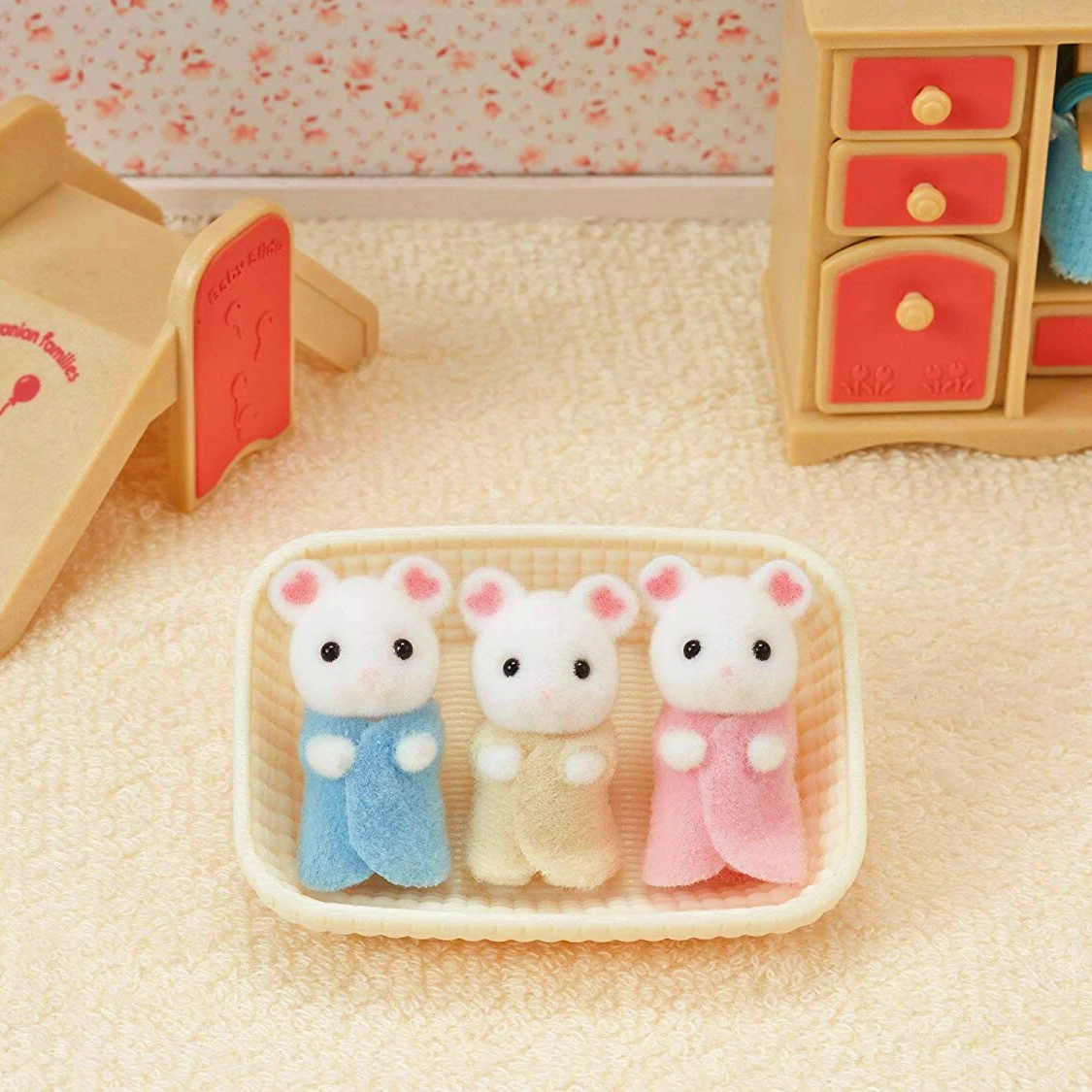 Triplets Mary, Edward and Elizabeth Marshmallow are the newest arrivals in the mouse family! Being so young, they aren’t yet able to do a huge amount by themselves, but that’s no problem as their doting parents and big brothers and sisters always want a turn playing games with them or taking them out in the pram.