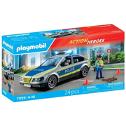 Cool PLAYMOBIL police car with flashing blue light and sound module (1.5 V micro batteries required are not included in the item), removable roof and space for up to 4 figures. Get in and help the police officer on duty to stop speeding drivers on the road, secure accident scenes and collect evidence and police data in the notebook. Step into action with the PLAYMOBIL Police Patrol Car! Flashing lights, realistic sirens, and space for all your essential gear make it perfect for high-speed chases and securing the scene. With a removable roof, trailer coupling, and detailed accessories like a high-visibility vest, traffic cones, and a police notebook, every mission feels real. Whether stopping speeders or collecting evidence, the PLAYMOBIL police car is ready for thrilling adventures that bring law and order to your playroom. Add this feature-packed patrol car to your PLAYMOBIL collection today! Additional Information Figures: 1 man with police cap Accessories: 1 patrol car with light & sound module, 1 holster with pistol, 1 high-visibility vest, 1 mobile radio telephone, 1 camera, 1 notebook, 1 police trowel, 1 oil slick, 2 traffic cones