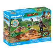 • Detailed playset featuring a PLAYMOBIL figure, a Velociraptor, a baby Stegosaurus, an opening dino egg, laptop, camera, basket, and many other exciting extras.