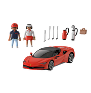 Set includes a Ferrari SF90 Stradale with light effects, two figures, golf bags, a suitcase, and other accessories.