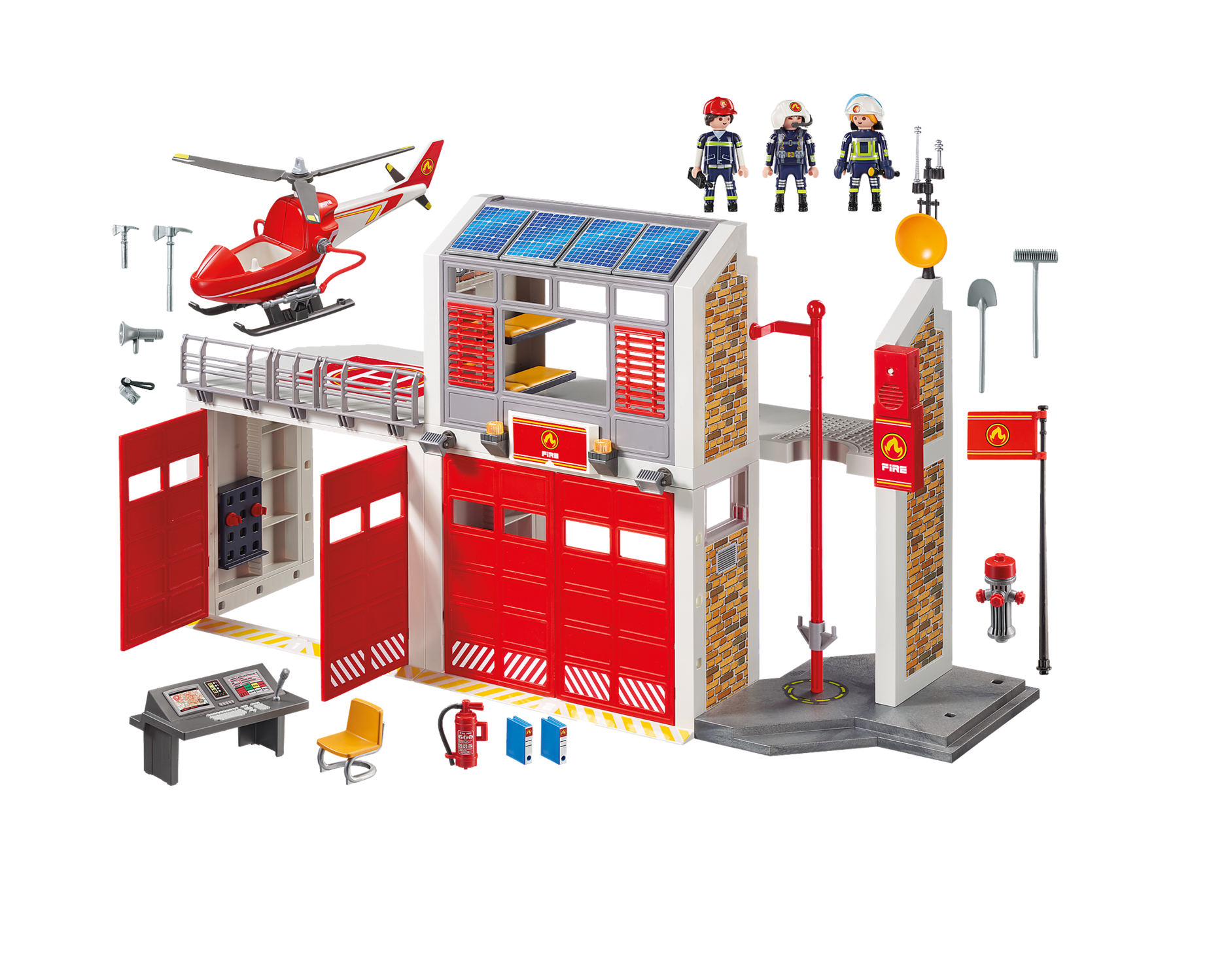 The Fire Station includes sliding pole, fire alarm (2 x AAA batteries required), helicopter and helipad, as well as two garages for emergency fire vehicles.