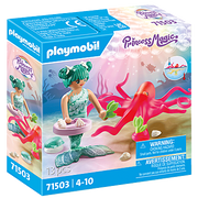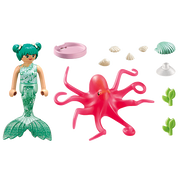 Come into the fantastic PLAYMOBIL underwater world with the sweet play figure set, Mermaid with Colour-Changing Octopus. The mermaid is visiting her good friend, the octopus. Out of sheer joy, the large octopus immediately turns yellow. What a fun meeting! With imaginatively designed figures and animals, as well as fantastic accessories, the PLAYMOBIL Princess Magic Underwater World invites children into a magical play universe. The set includes a mermaid, hair bows, a decorative shell with suction cup, and an octopus. The octopus changes colour with the alteration of water temperature.