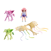 Make heavenly trips to the rainbow with the cute Pegasus Foals in the Clouds from PLAYMOBIL. The rainbow princess and her Pegasus foals are inseparable and love to fly through the air together. Thanks to her agile cloud plane, the princess can accompany her darlings at all times. Side by side, the trio whizzes through the clouds. Enchanting characters, magical creatures and fabulous buildings whisk children away on a fabulous play adventure.