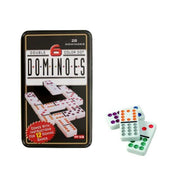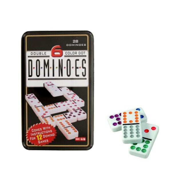 A set of 28 double D6, color dot dominoes, in a sturdy metal tin.