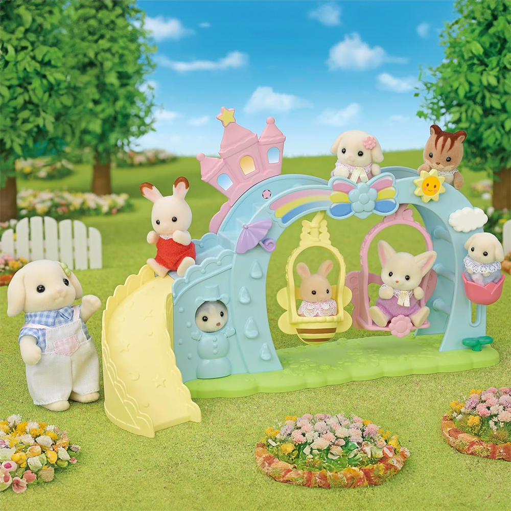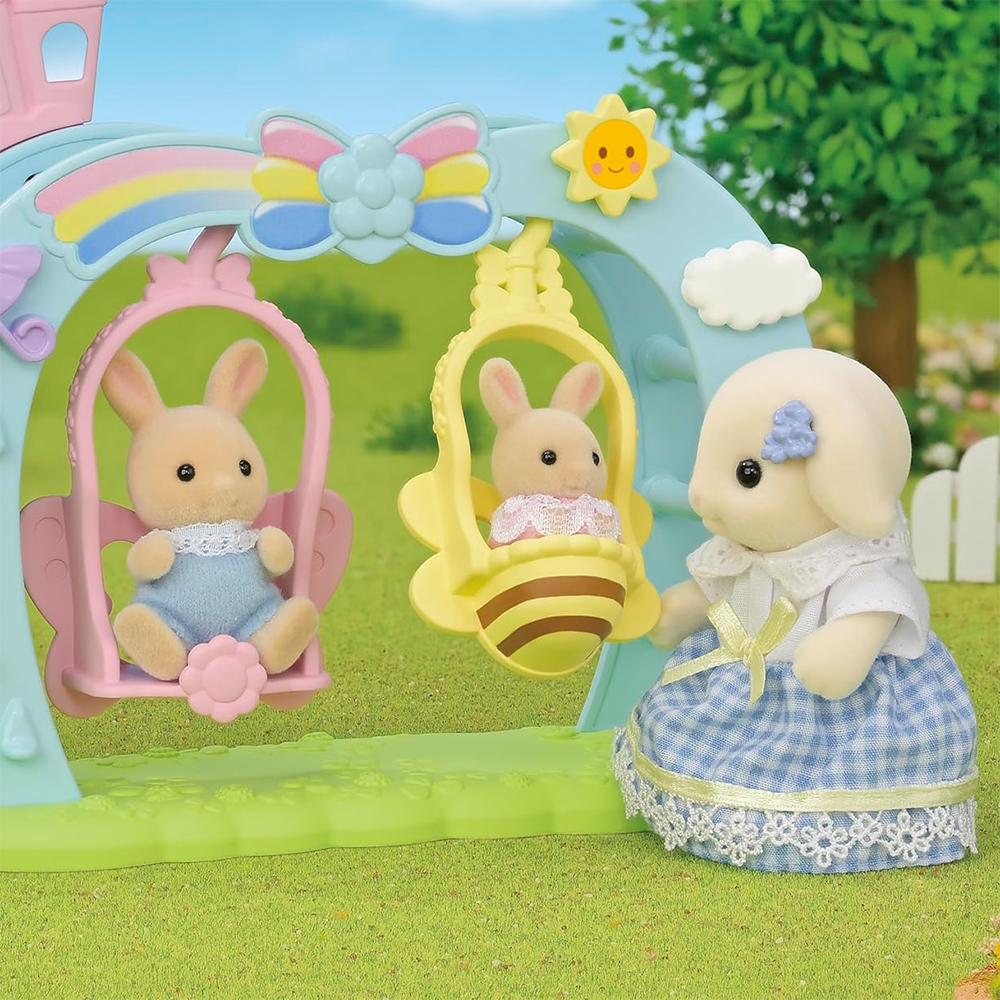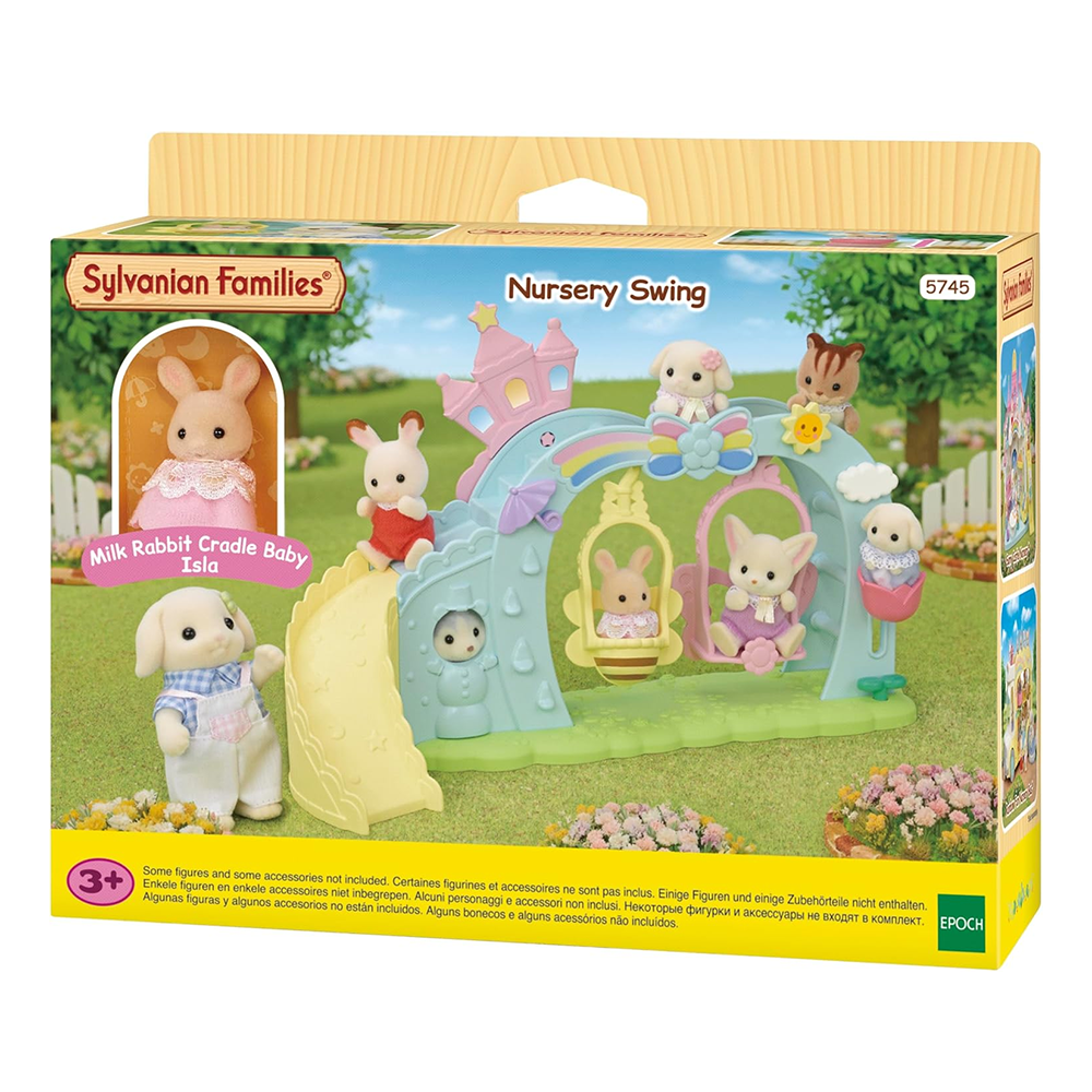 Make your Sylvanians look like little bees and butterflies on the adorable Nursery Swing! Isla Milk Rabbit Baby loves playing out on the swing and tulip lift with all of her friends.