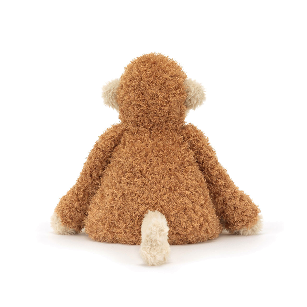 Junglie Monkey is tufty, goofy and so very cuddly. This banoffee monkey has soft golden accents, a curly tail and a cheeky grin. With a chocolate-drop nose, doughnut ears and chunky stitch toes, Junglie Monkey is one to curl up with.