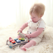 A classic hammering bench with 6 robust colour-coordinated sorting shapes. The hammer comes permanently attached so it'll never get lost. An early learning and developmental toy made from environmentally friendly wheat-fibre plastic. Each sealed sorting shape includes an internal rattle for providing sensory stimulation.