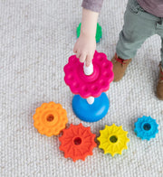 Drop the vibrant discs onto the threaded corkscrew pole and go ooooh as they spin fast and smooth to settle onto the reversible base.
