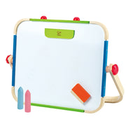 This tabletop art studio keeps artists busy with a whiteboard, chalk board, and magnetic sHapes. Play with colours. Use crayons to learn the names of new shades. Ages 3+