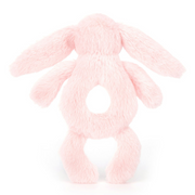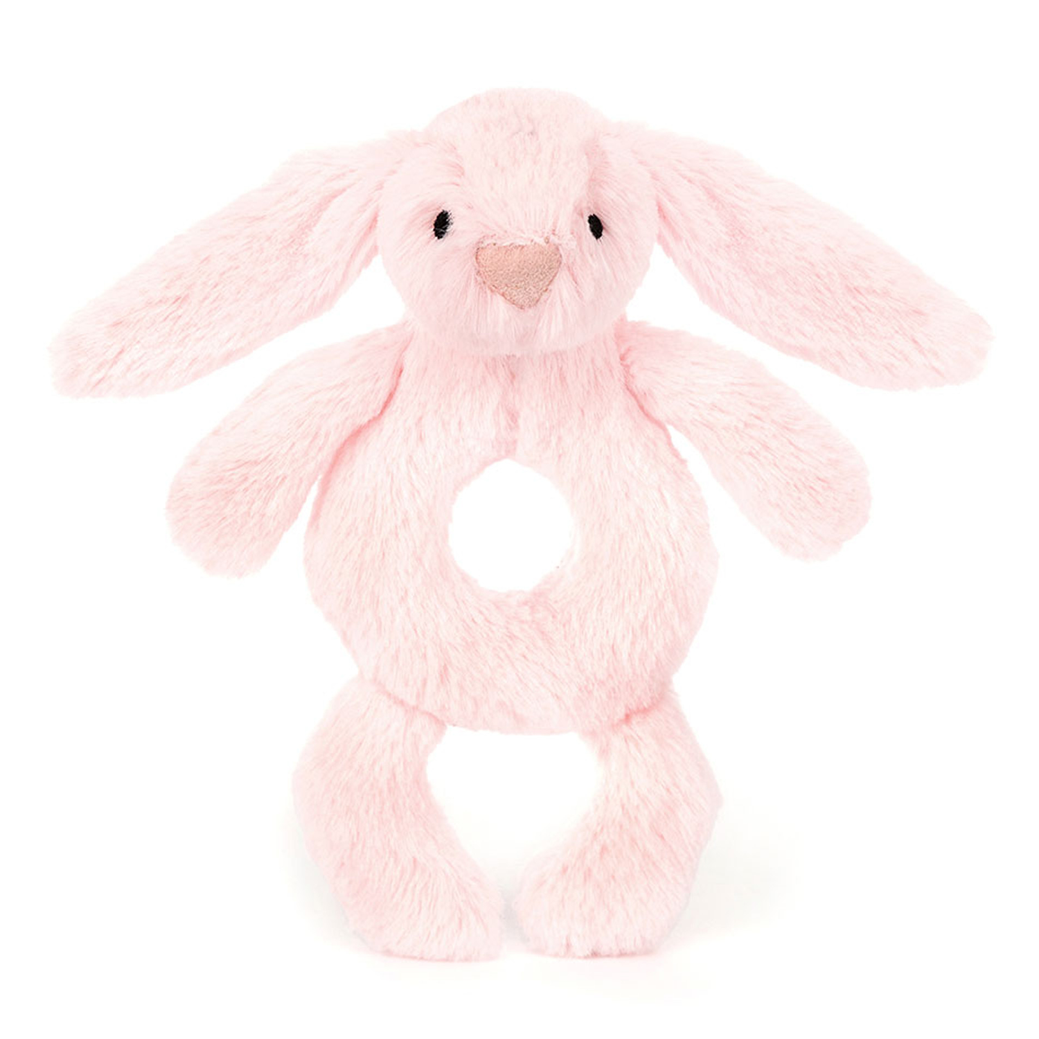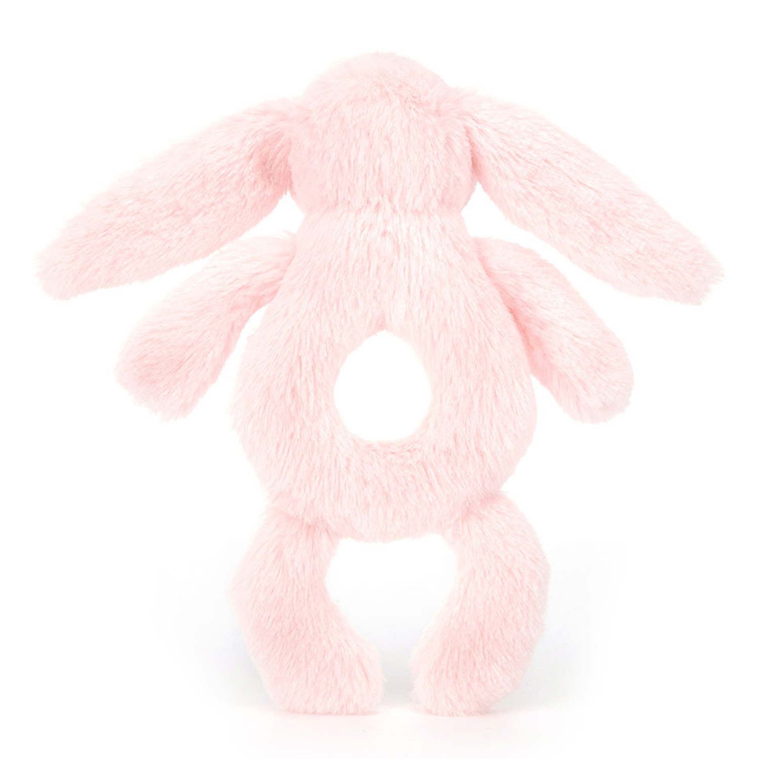 A treat for tiny hands, Bashful Bunny Ring Rattle can be grabbed by its soft paws, long lop ears or ring-shaped tummy. When given a gentle shake it will sound the rattle inside, much to baby’s delight! Crafted in baby pink coloured fur made from recycled fibres featuring a Bashful Bunny pink suedette nose and embroidery eyes.