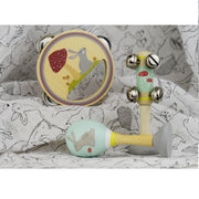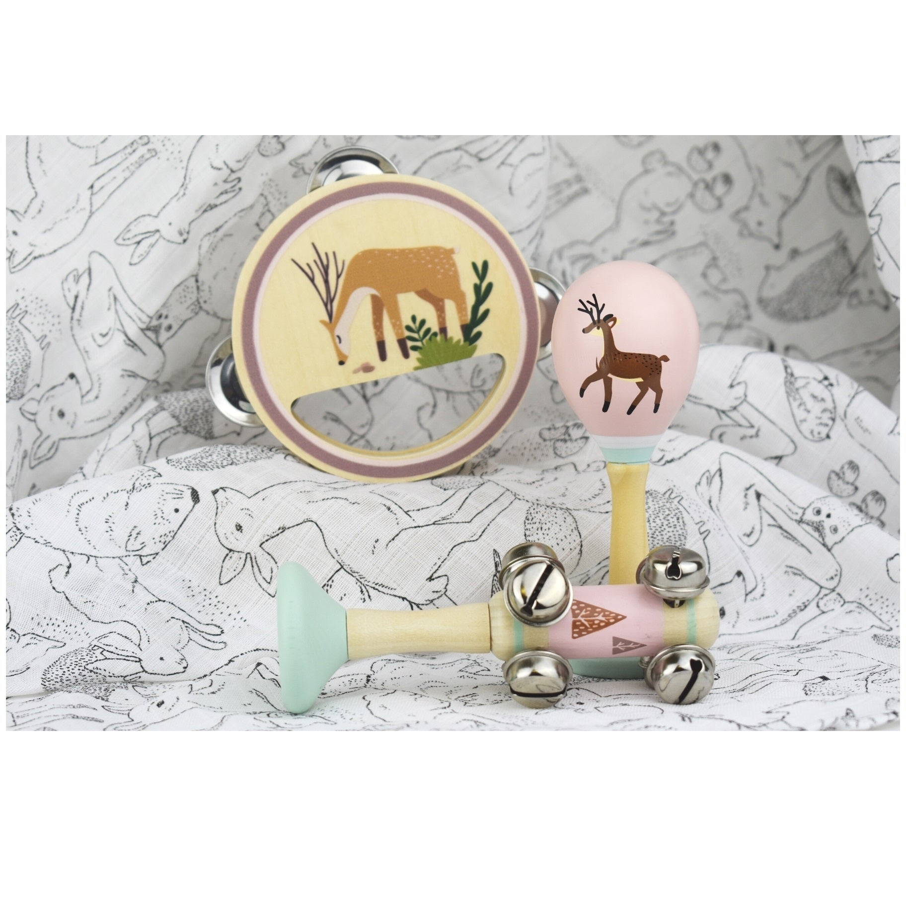 In this gift pack set you will get 3 assorted musical instruments including 1 maraca, 1 bell stick and 1 tambourine for small children to shake and learn to make music. There are 4 different woodland animal designs including a rabbit, deer, hedgehog or fox.