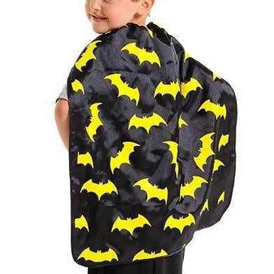 Our spooky Bat cape will sure to delight your little one. made with quality satin with a comfortable Velcro fastening  This cape is printed with bats flying all over it. Great for batman fans or Halloween. One size perfect for ages 2+