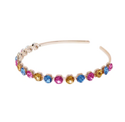 Perfect for special occasions or every day. This thin metallic band is adorned with sparkling gemstones which sparkle from any angle. Choose from pinks with a pink band or rainbow with a gold base.