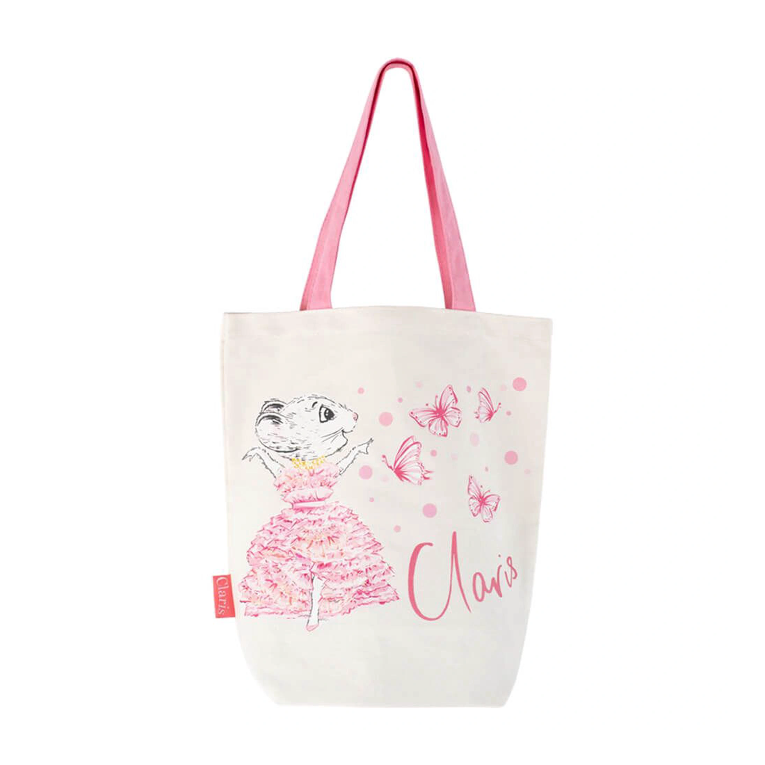 Made from canvas, single sided design. Features pink handles and Claris sew-in label. Bag fits Claris books and other stationery & accessories inside.