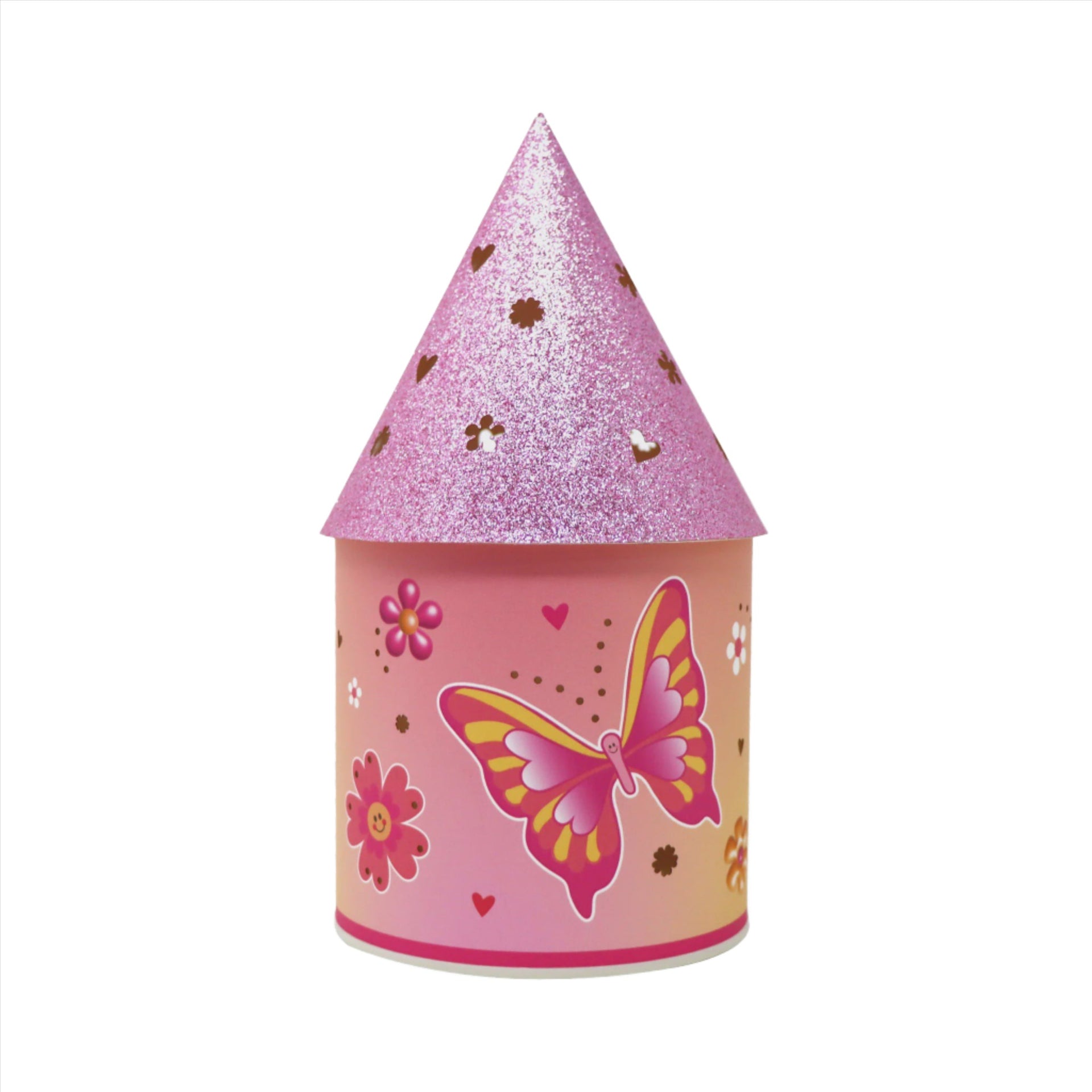 Pink Poppy's Vibrant Vacation Colour Changing LED Lantern brings a sense of magic to all kids. This soft illuminating light-up LED Lantern is designed to comfort children as they sleep. Switched on, watch as the light smoothly transitions between a rainbow of colours illuminating a dark room. Switched off it acts as a decorative piece with a glittering roof displaying beautiful butterflies and flower illustrations. Completely safe for little hands all day and all night long.