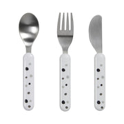 Fun and practical cutlery set from Done by Deer with a spoon, knife and fork for little eaters learning to eat on their own. A cute Dreamy Dots design features little polka dots on the handle.