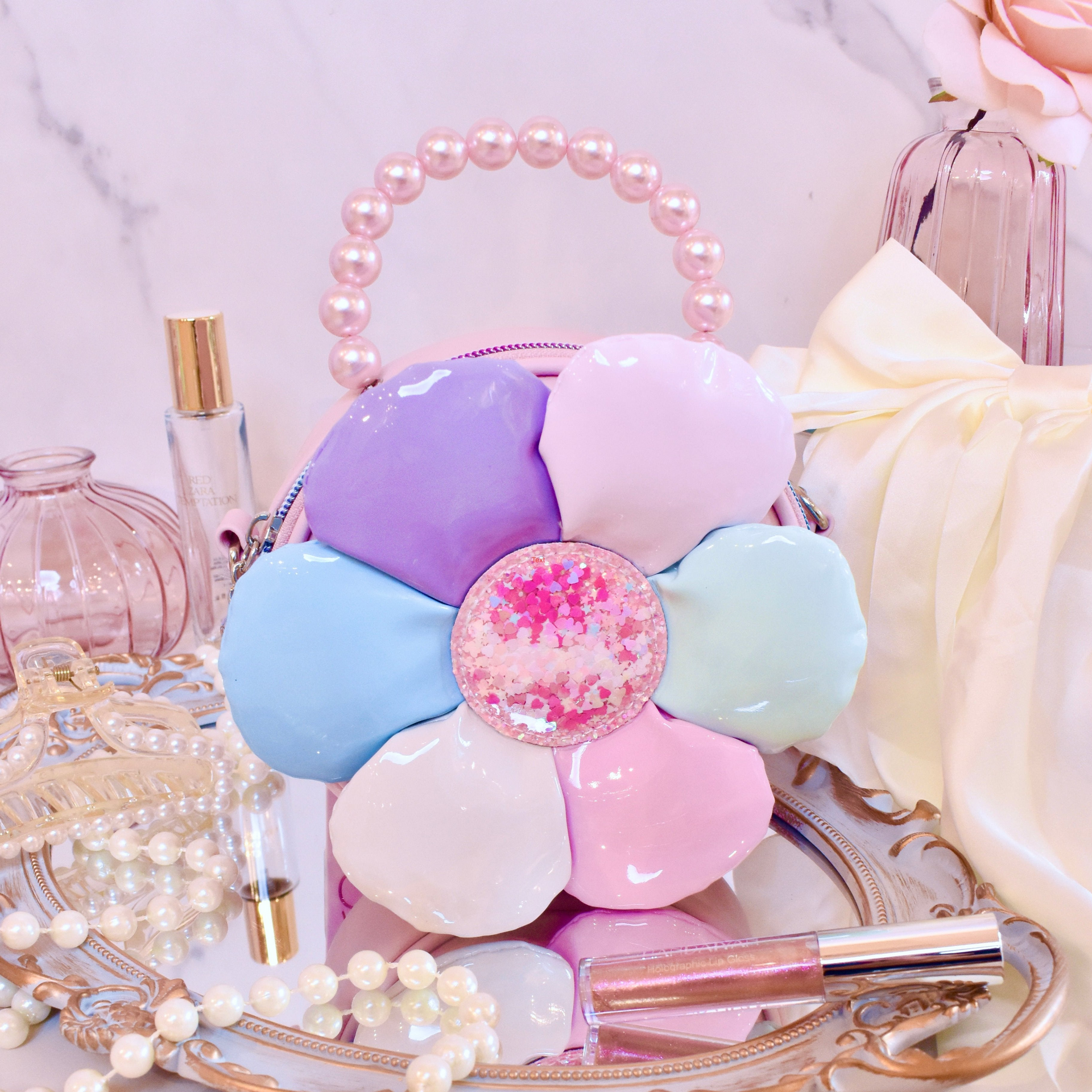 This bag features shiney vinyl petals, a confetti filled center, & a pink pearl beaded handle. Keep those essentials close with this statement piece!