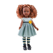 Paola Reina Nora is a 32 cm Funky Amiga doll with curly orange hair and gray eyes. Nora is wearing a very light turquoise dress with the part of the skirt made of tulle and with a yellow flower ornament at the waist. She also has striped stockings in turquoise tones to match her dress.