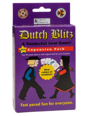 Enter the enhanced Purple Dutch Blitz Expansion Pack with 4 new colors, and 4 new symbols! Folks can still use each deck separately, but now, when 5-8 play together, players' decks are more distinct and identifiable, making “Double Dutch” even faster!