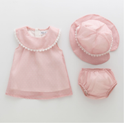 Gorgeous Polka dots printed A line dress with contrast lace trim with coordinating sunhat and underpants. the dress is lined for soft skin of your baby.