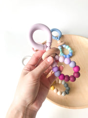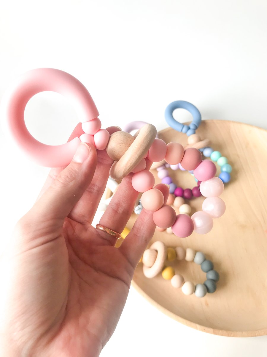 Our brand new figure 8 teething rattle has been created to keep your little's engaged! a variety of colors to keep babes excited and beechwood accents to create that soft 'tink' while playing with the rattle.