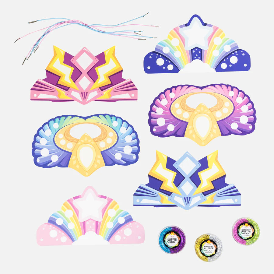 This clever craft kit contains everything kids need to decorate and assemble their own colourful, glittery superhero crown - with six coloured cardboard crowns and a vibrant set of our amazing mess-free Glitter Goo (it's pixie dust without the fuss) to level up the crafternoon.