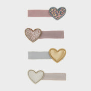 The sweetest twinkly heart clips for your little sweethearts! A lovely combo of ribbon covered bar clips with lovely metallic and glitter hearts, great to wear together or on their own.
