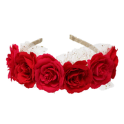 Pink Poppy's Christmas Floral Headband. Say hello to the festive season in this statement flower headband. Features a range of faux flowers in hot pink and red on a bed of soft tulle and dazzling glitter band.
