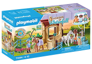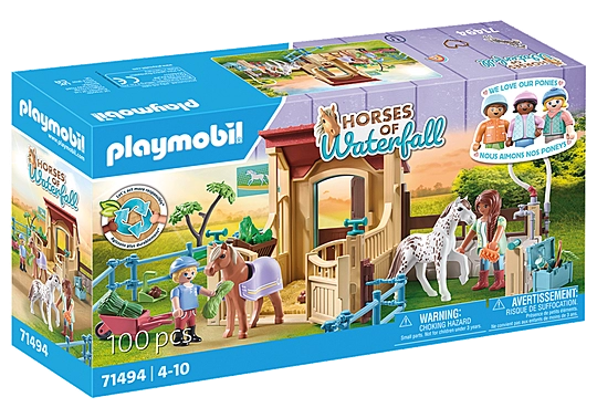 Bring home the magic of a countryside riding stable with this set from Playmobil's Horses of Waterfall range. The set features two poseable Playmobil figures and two detailed pony figures, ready for endless adventure. Groom the ponies at the wash area, and lead them to the lockable pony box for rest after a long day. The included fences can be used for expansion, making this set compatible with other Playmobil properties.