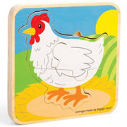 A 6 piece puzzle. Cluck, cluck! What came first: the chicken or the egg? Find out with our Chicken Life Cycle Puzzle. With four layers to explore, little hands can piece together the evolution of an egg, to a chick, to an adult chicken. The chunky pieces and bright colours are engaging and perfectly sized for youngsters aged 18+ months. Life cycle puzzles helps tots to develop a deeper understanding of living things and their habitats. Wooden puzzles help develop fine motor skills and language development.