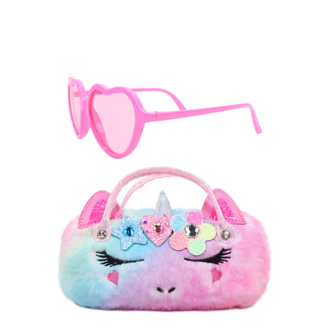 Open the sunroof, crank up the tunes, and let the rays shine in! Offering 100% UV protection, these pink heart-shaped sunglasses will provide safety AND style all summer long! With a coordinating rainbow ombre plush Miss Gwen the unicorn case, this sunnies set is the ultimate addition to their days of fun in the sun!