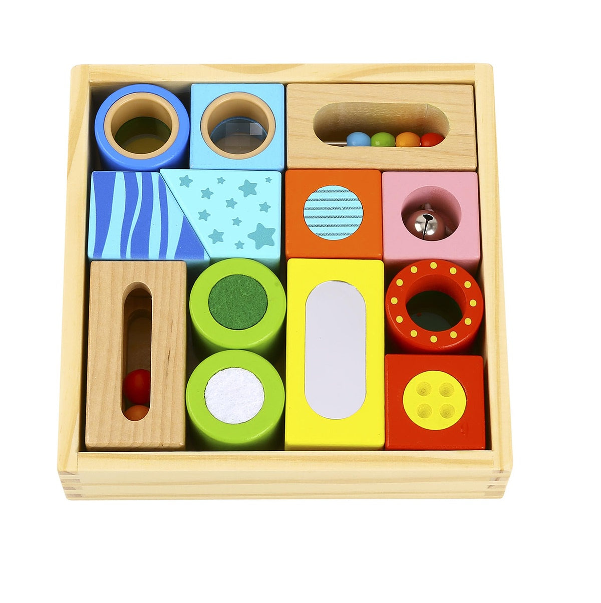 Your child will love to explore texture, colour, touch and sound with these sensory building blocks from Tooky Toy. This set of sensory blocks have so many different senses and functions, your child will enjoy exploring each one and what it can do. Once they've explored the blocks individually, these blocks can be stacked, sorted and played with for interaction and play on so many levels. Each Wooden Block sensory set comes with 13 separate blocks which nestle neatly within a wooden tray. Each wooden multifunction sensory sound block set from Tooky Toys is made from timber, Perspex and fabric and is finished to the highest quality and painted in child safe, non toxic paint.