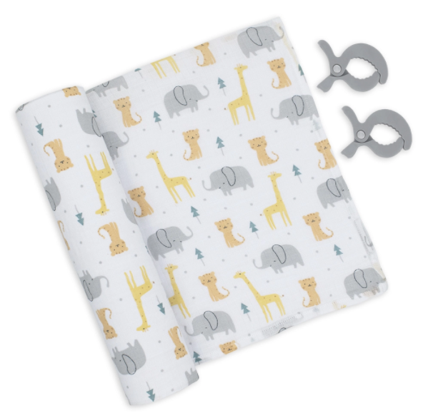 Perfect for when you'™re out and about with baby, this muslin swaddle wrap, and pram peg set is as stylish as it is practical Made from the 100% cotton, the generously sized swaddle wrap is ideal for swaddling, as an extra layer in the pram or even a breast-feeding cover. The matching pram pegs are ideal for keeping your wrap attached to the pram and providing shade for baby on sunny days.