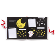 A bonus pocket in the back includes: an envelope for a birth announcement, a tiny envelope for a lock of hair, a booklet for jotting down baby’s first words and phrases, an accordion-folded growth chart, an envelope for handprints and footprints, and stickers to decorate photos. A pair of ribbons tie the padded case shut, making for a gifty package.