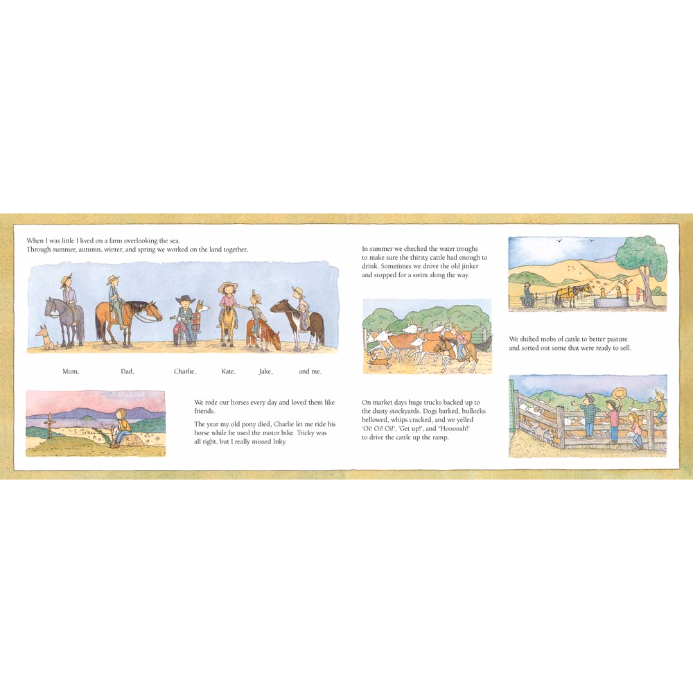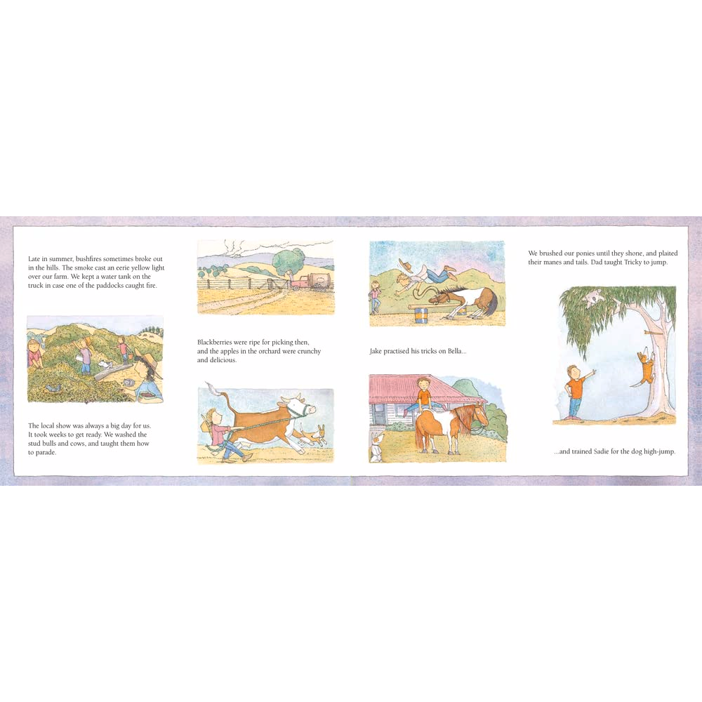 Trick-riding horses, mustering cattle, training the dog, competing at the local show, feeding calves, picking mushrooms, raising a baby wombat, building cubbies, cutting hay, swimming ponies in the dam, hypnotizing chooks ... all the activities through the seasons are depicted with child-like mischief and humour.