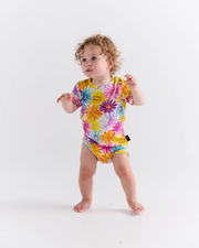 Say hello to all-day comfort and cuteness with our Petal Power Organic Short Sleeve Romper! Made from the softest, snuggliest organic cotton jersey, these little wonders are designed for wriggling, rolling, snoozing, and everything in between. With short sleeves for sunny-day ease, handy snaps for speedy changes, and a whole lot of Kip&Co colour and charm, they’re a must-have for mini movers and groovers. Whether it’s nap time, playtime or out-and-about time, this romper’s ready to roll! Featuring a floral dreamland, with painted daisies in yellow, pink, blue and purple.