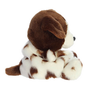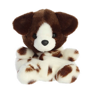 Freckles is a plush toy with a brown and white colour pattern. This plushie has a predominantly white body with brown spots, especially on the ears, face, and paws. The face features a white snout, a small black nose, and adorable round eyes that give it a charming and gentle expression.