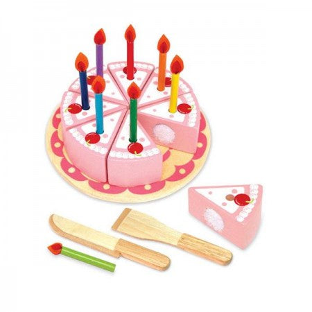 A colourful wooden toy for entertaining all of your friends. Features an 8-slice wooden party cake on a serving plate, 8 removable wooden candles with felt flames, a child's play knife and a spatula.