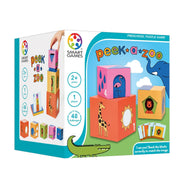 The zoo-animals love playing peekaboo! Can you spy with your little eye where these fun-loving animals need to go? Choose a challenge and try to stack the right cubes as shown on the challenge card.Peek-A-Zoo is a great educational game for pre-schoolers to practice language skills, learn about colours, animals, and concepts as above, below, inside and outside. This educational game is made of qualitative, durable cardboard and is easy to store and take with you wherever you go.