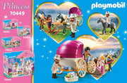 figures: 1 princess, 1 prince, 1 coachman Animals: 2 horses Accessories: 1 horse-drawn carriage with folding roof and floral decoration, 1 whip, 2 saddlecloths, 2 collars, 4 sluices, 1 drawbar, 1 cylinder with bow, 1 crown, 1 collar, 1 picnic basket, 1 bouquet of flowers with floral paper, 1 clutch, 1 suitcase, 2 apples, 1 bottle of sparkling wine with cloth, 2 champagne glasses