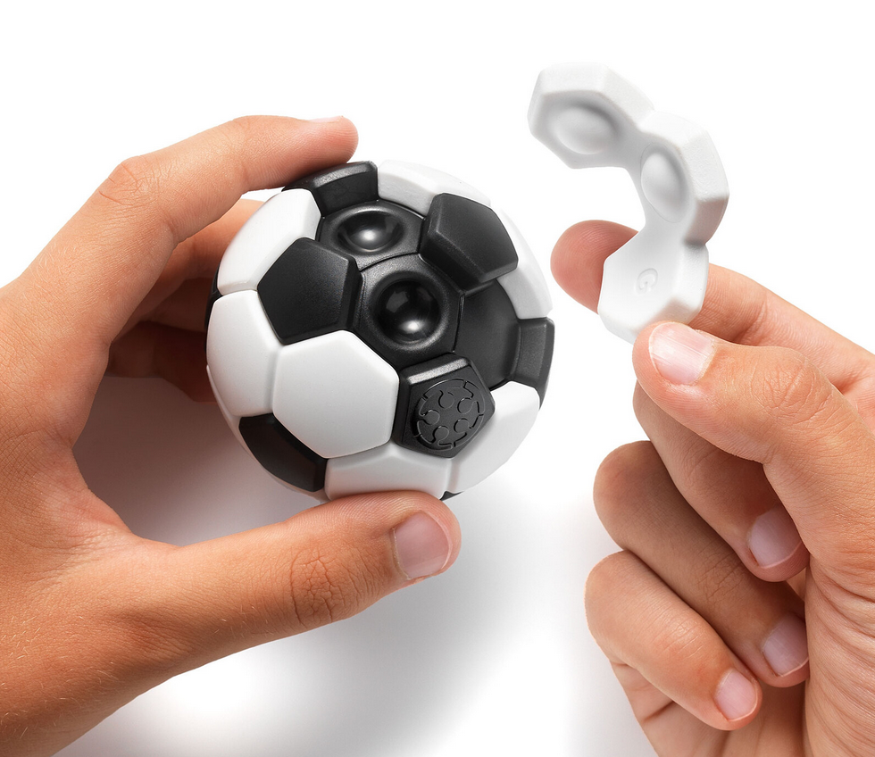 Ready to take a shot at the Plug & Play Ball? Try to fit all 7 puzzle pieces on the ball. But watch out! Moving the small starting piece during the game will get you a red card. A mini 3D puzzle game that doubles as a fidget game and that needs no setup. Just plug and play! Can you tackle this challenge?