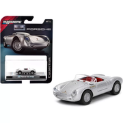 Brand new 1/64 scale diecast car model of 1955 Porsche 550 Spyder Silver Metallic with Red Interior "Collection" Series die cast model car by Majorette. Brand new box. Real rubber tires. Die-cast metal body. Detailed exterior, interior. Officially licensed product. Dimensions approximately L-2.5 inches long. Manufacturer's original unopened packaging. Comes in a blister pack and includes plastic display showcase.