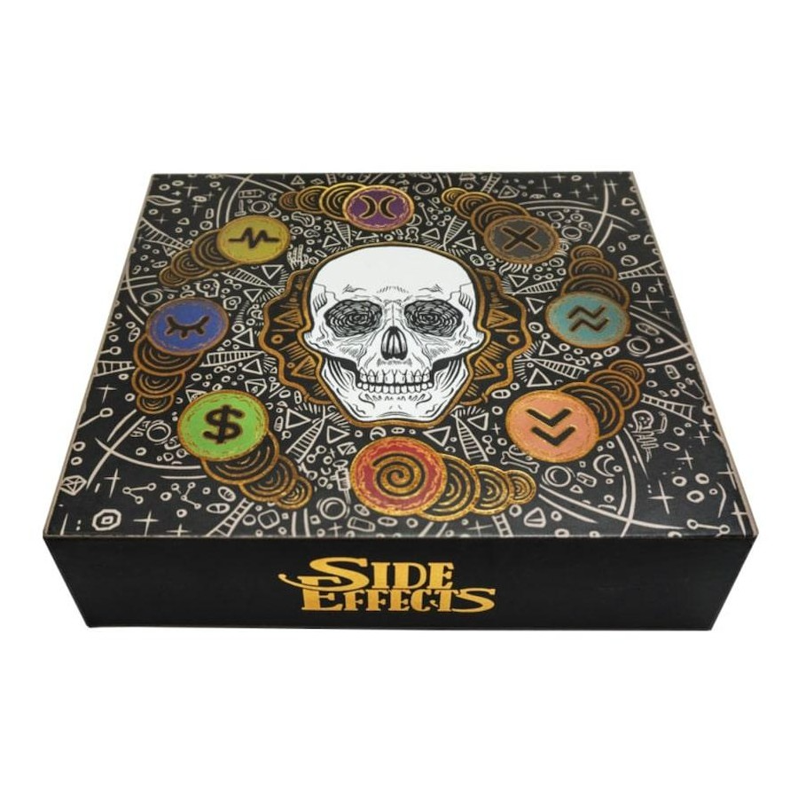 Side effects is a game of self-medication and personal demons that plays just as well at a bar as at game night. It's easy to learn, fun to play, and lets you be as vindictive as your heart desires. Each player receives four unique Disorders. The object of the game is to treat these with Medication and/or Therapy. Take a Medication by placing it on top of the corresponding Disorder. But beware! Every Medication contains side effects (new Disorders that other players can give you). Use Episode cards to trigger unique punishments of other players' untreated Disorders. Use Therapy cards to discard a Disorder without taking Medications, but be careful because it could come back. Trade cards, form alliances, screw over your friends… it's fun for everyone! Develop your own strategies and compete to learn who's truly the master of the medicine.