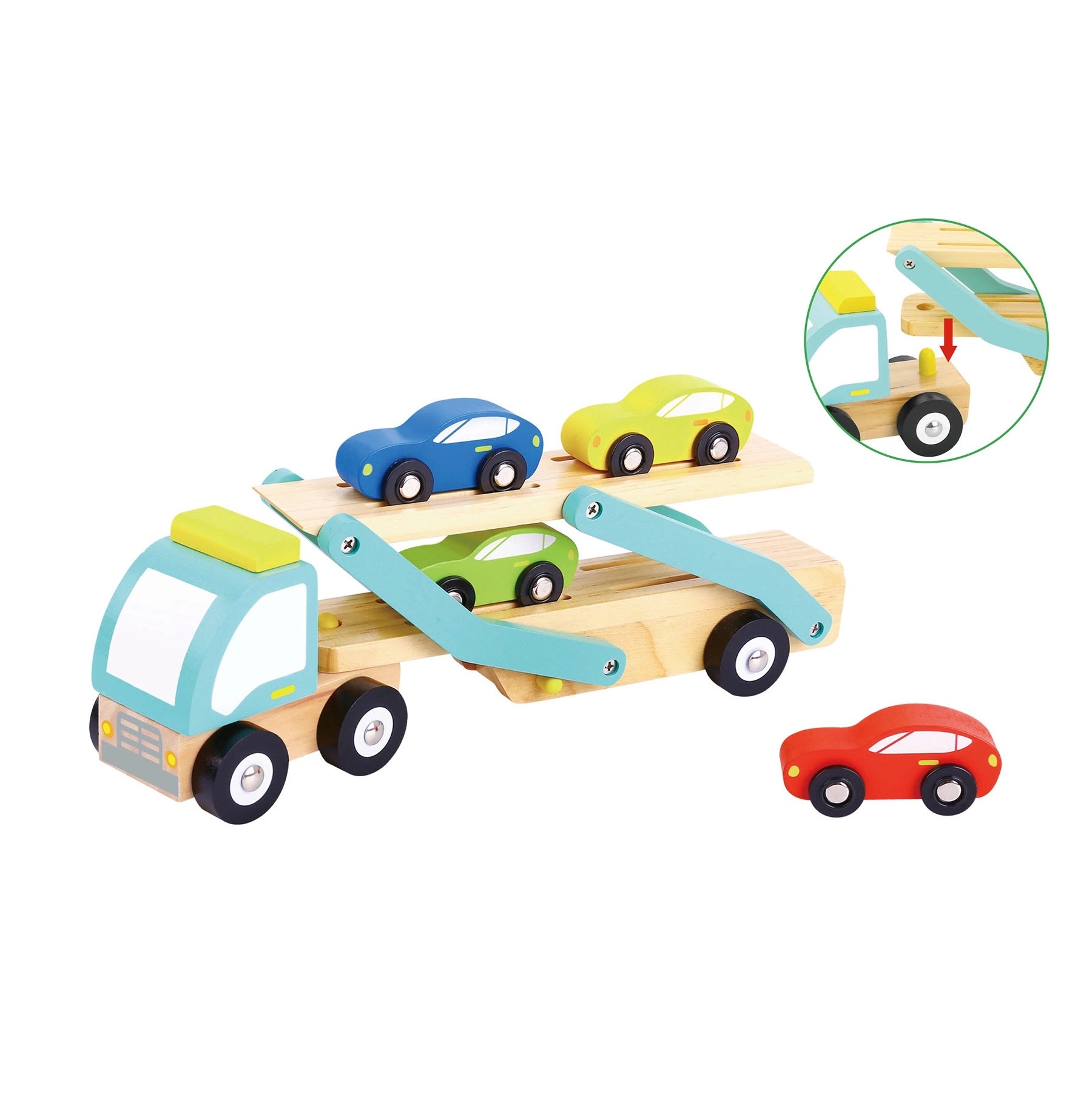 These wooden vehicles with car carrier encourage open play and pretend play. By creating their own story, children explore the world around them and learn to problem solve and encourages social interaction.